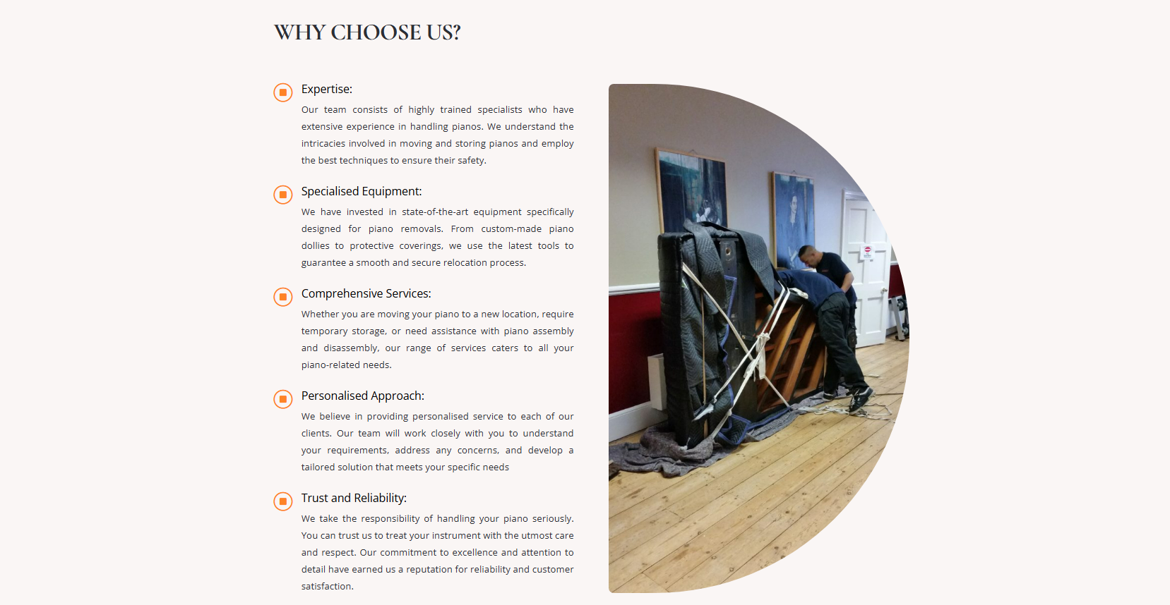 Clarified service scope, helping potential clients quickly understand the specialized care and equipment the company brings to piano relocation.